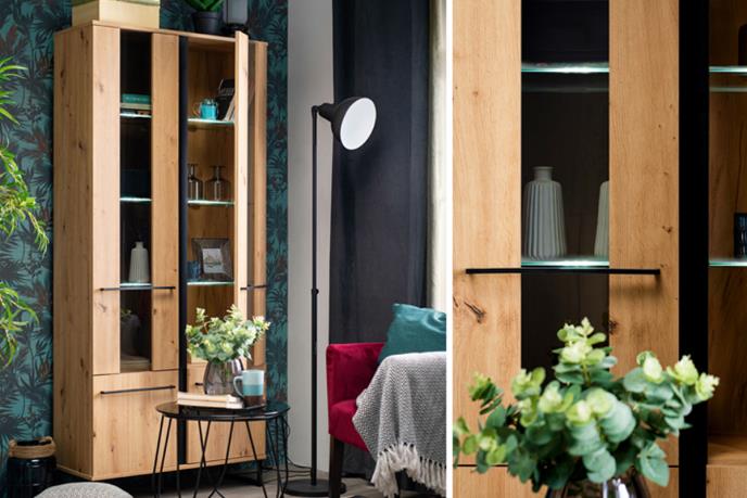 Kako ambijent sobe u kojoj preovlađuje crna ne bi izgledao sumorno i beživotno, izuzetno je važno posvetiti pažnju osvetljenju. Luster sa kristalima bio bi sjajan izbor, a odličan efekat možete ostvariti i ugradnom rasvetom na vitrinama i TV policama. Vitrina MOLISE 1K VS u kombinaciji artisan hrasta i crnog bojenog stakla odličan je komad za vaš dnevni boravak, a pruža i mogućnost dodavanja rasvete, baš kao i TV polica MOLISE. Odličan dodatak ambijentu biće i zidna polica MOLISE ZP u dekoru artisan hrasta i crnog bojenog stakla, na kojoj možete čuvati omiljene sitnice i dekoracije.
