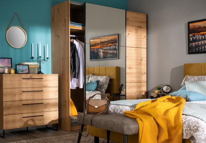 Savet je da u moderno-rustičnom prostoru mešate potpuno suprotne materijale. Garderober SIERRA 180 OG u dekoru artisan hrasta sa ogledalom na jednom krilu predstavlja model garderobera savremenog dizajna, a čini ga upravo spoj suprotnih materijala. Komoda SARDINIA 4F takođe bi se odlično uklopila u predloženi ambijent, a spoj je topline naturalnog i rustičnog artisan hrasta sa primesama kontrasnih suptilnih crnih elemenata dekora.