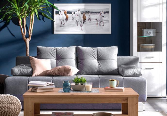 Ukoliko se odlučite za plavu boju zidova u dnevnom boravku, ona sama po sebi može biti fokusna tačka. Uz svetle komade nameštaja, zid postaje savršena podloga za naglašavanje samog nameštaja. Vitrina VALENCIA u opak beloj i dekoru artisan hrasta i ležaj ELENA u svetlo sivom štofu, zajedno sa slikom KONJI sa belim ramom prave kontrast tamnom zidu. Klub sto je takođe neizostavan deo dnevnog boravka, a dekor artisan hrasta na klub stočiću OSCAR daje toplinu ambijentu, dok istovremeno daje i kontrast hladnim tonovima plave i sive. Kako plava boja ne bi potpuno izgubila na svojoj važnosti i jačini, dodajte neki zeleni detalj, npr. kućnu biljku.