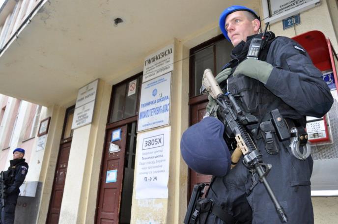 Obezbeđenje ispred biračkih mesta je ogromno. Ispred Tehničke škole nalazi se četvorica pripadnika Euleksa sa dugim cevima, a neki od njih se nalaze i u samoj školi. Ispred je takođe i oko tridesetak pripadnika KPS kao i pripadnici Kfora koji su dovezli vozilo za razbijuanje demonstracija.