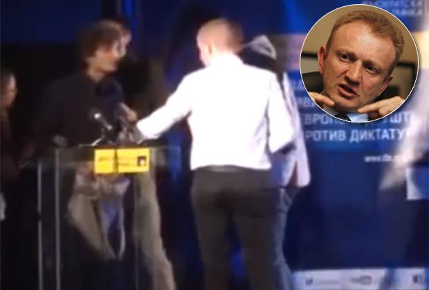 "Čitajte Vikiliks, tajne depeše...Tamo su dokazi veleizdaje Borisa Tadića, Borislava Stefanovića..", vikao je mladić dok su ga izbacivali sa scene.