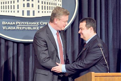 Novopečeni srpski šef diplomatije Ivica Dačić prvi se sinoć sastao sa Štefanom Fileom, komesarom za proširenje EU, koji je inače u zvaničnoj poseti Srbiji. Kako saznajemo, Dačić je zbog drugih obaveza sačekao Filea na aerodromu, a zatim su imali kratak neformalan susret uz kafu u hotelu u kome je visoki evropski zvaničnik odseo.
