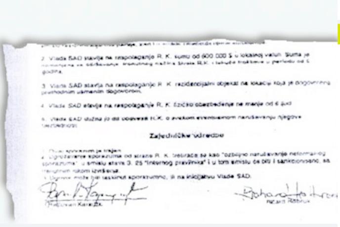 Portal Vesti objavio je fotokopiju stranice tajnog sporazuma Karadžić-Holbruk, koji je bivšem predsedniku Republike Srpske garantovao bezbednost i zaštitu SAD u zamenu za povlačenje iz javnog i političkog života. Podseća se da se Radovan Karadžić prvi put pojavio pred Haškim tribunalom krajem jula 2008. godine i odmah pozvao na taj sporazum! Bivši predsednik Srpske je tada naveo da je imao dogovor sa SAD, precizirajući da su njegovi "ovlašćeni predstavnici" 1996. godine od Holbruka dobili ponudu u ime SAD prema kojoj je njegova obaveza bila da se povuče iz javnog života i da ni na koji način ne ometa sprovođenje Dejtonskog sporazuma.