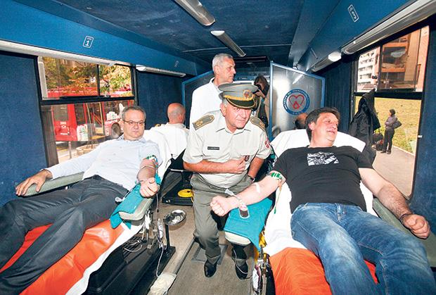 BEOGRAD - Ministri odbrane i privrede Bratislav Gašić i Željko Sertić pokazali su dobru volju i učestvovali u jučerašnjoj dobrovoljnoj akciji davanja krvi koju su organizovali Ministarstvo odbrane i Institut za transfuziologiju i hemobiologiju VMA. Ministri, kao i više desetina pripadnika vojske, dali su krv u specijalnom transfuziološkom autobusu ispred zgrade Ministarstva odbrane.