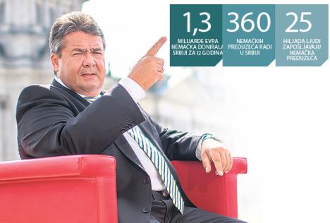 - Drugi čovek nemačke vlade imaće sastanke s državnim vrhom. Nemačka očigledno želi da investira u Srbiju, pa to i dokazuje time što je u privrednoj delegaciji veliki broj nemačkih kompanija, među kojima su Dojče banka, Dojče berza, „Klas“ (evropski lider u proizvodnji kombajna), „Sat“ (kompanija za softvere) BASF (lider u hemijskoj industriji), „Tenis Lebensmitel“ (nemački proizvođač svinja).