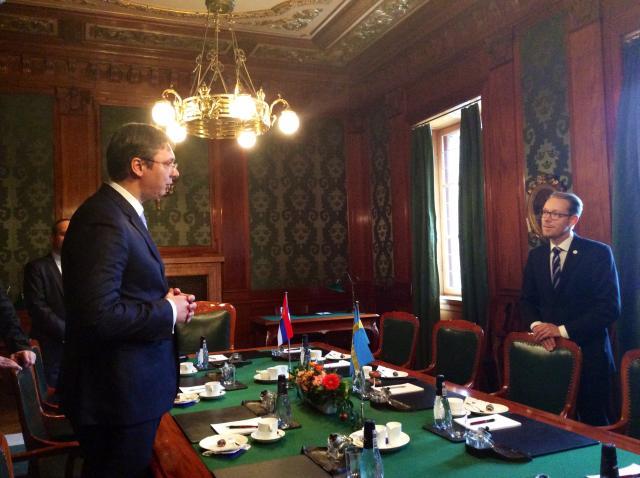 STOKHOLM - Premijer Srbije Aleksandar Vučić sastao se danas u Stokholmu sa prvim zamenikom predsednika švedskog parlamenta Tobijasom Bilstromom sa kojim je razgovarao o evropskom putu Srbije i bilateralnim odnosima. Vučić je istakao da Vlada Srbije sprovodi teške reforme, bez pritisaka spolja, za dobrobit srpskog naroda.