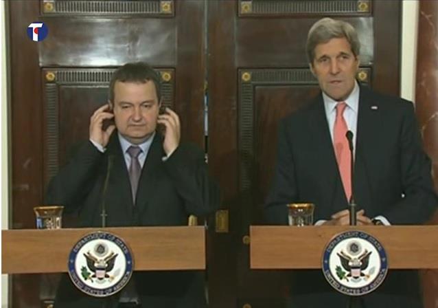 Keri je, na zajedničkoj konferenciji za novinare pred početak sastanka, poželeo dobrodošlicu Dačiću u vreme kada, kako je rekao, "Srbija preuzima sve više važnu ulogu u mnogo pogleda, najpre preuzimajući predsedavanje OEBS-u, i to u veoma važnom trenutku s obzirom na sporazum iz Minska i napore koje ulažemo u cilju njegove primene pod predsedavajućom ulogom Dačića".