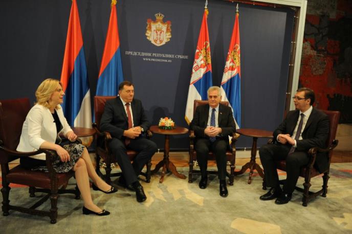 BEOGRAD -– Predsednici Srbije i Republike Srpske Tomislav Nikolić i Milorad Dodik, kao i premijeri Aleksandar Vučić i Željka Cvijanović sastali su se danas u Palati Srbija u Beogradu, uoči zajedničke sedice vlada dve države.
