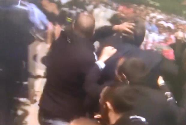 Premijer Srbije Aleksandar Vučić, njegovi saradnici i pripadnici obezbeđenja, zasuti su danas kišom kamenica i udarcima u Potočarima.