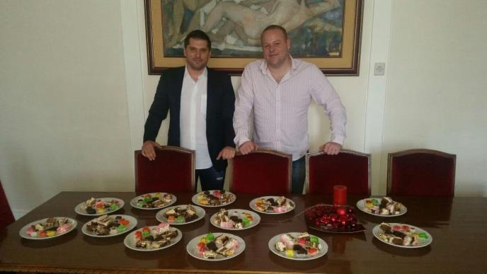 Funkcioner SPS Nikola Nikodojević i poslanik Vanja Vukić su sve zaposlene u gradskim institucijama počastili tortom i kolačima