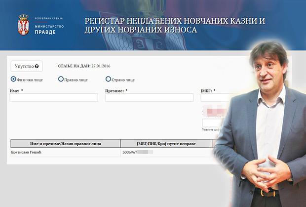 Međutim, kada u registar unesete lične podatke Bratislava Gašića, sa njegove pristupnice Srpskoj radikalnoj stranci iz 2008. godine, aplikacija pokazuje da je ministar odbrane dužan čak 5.000 dinara koje još uvek nije izmirio pred Prekršajnim sudom u Kruševcu!