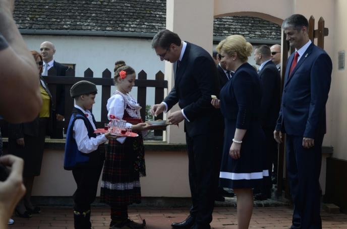Oni su se najpre susreli na mostu na Dunavu, na graničnom prelazu Bogojevo - Erdut.Vučić i Kitarović će kasnije preći u Srbiji, da bi u Donjem Tavankutu posetili Dom kulture "Matija Gubec".