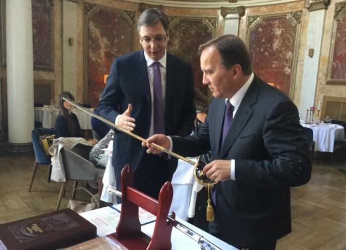 Premijer Srbije Aleksandar Vučić poklonio je premijeru Švedske Stefanu Levenu sablju, knjigu o Srbiji i drvenu dasku i oklagiju.
