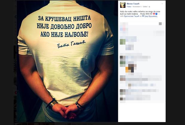 "Za Kruševac ništa nije dovoljno dobro ako nije najbolje! Bata Gašić", natpis je na majici koju je ponosno obukao Gašićev mlađi sin Milan.