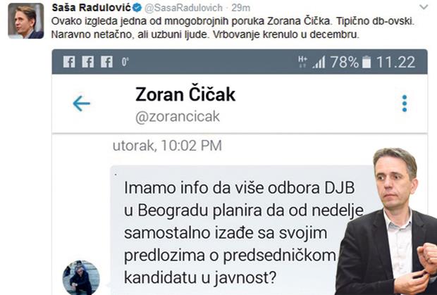Radulović je kao kontraargument na Tviteru objavio Čičkovu poruku, poslatu jednom članu DJB u kojoj ispipava teren - koliko je članova tog pokreta uz Jankovića, te je taj potez ocenio debeovskim.
