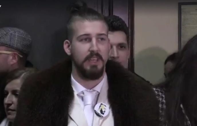 Ispred RIK-a stigao je, u prepoznatljivom belom odelu, u beloj lunuzini praćen trubačima i povicima "Samo jako - ave Beli".