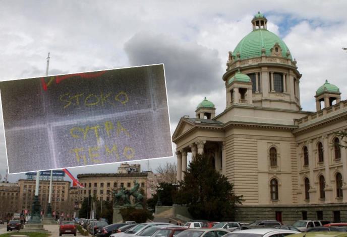 Iako je predsednica parlamenta Maja Gojković juče apelovala da se državna imovina ne ruši i ne uništava, poruke "Vučiću, pe.eru" i "Stoko" pojavile su se na zidovima ispisane u različitim bojama, a nije poznato da li iza njih stoje učesnici protesta.