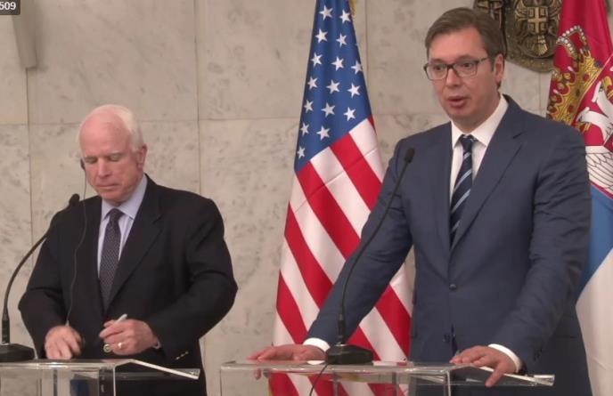 BEOGRAD - Premijer Srbije Aleksandar Vučić razgovarao je danas u Vili Mir sa američkim senatorom Džonom Mekejnom posle čega je usledilo zajedničko obraćanje novinarima.