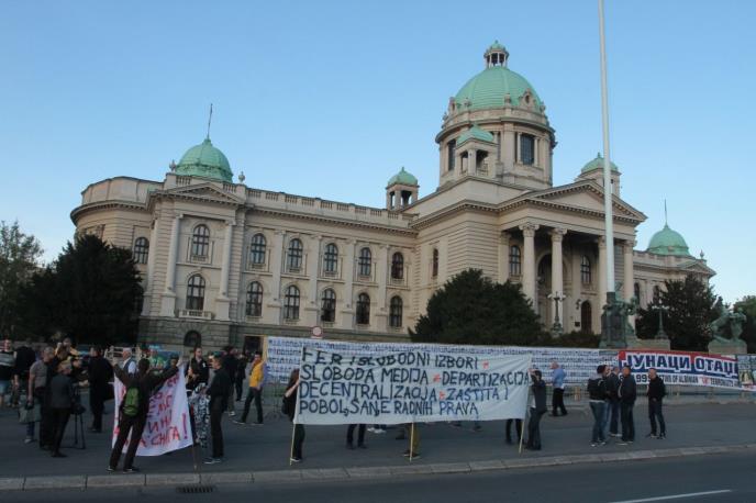 Manji broj učesnika koji je pristigao na plato ispred skupštine sa sobom je poneo i kastefon sa koga puštaju muziku, a spreman je i megafon.
