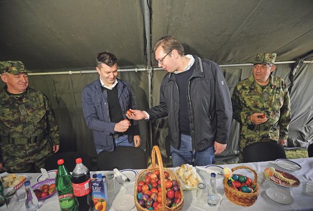 On je kasarnu u Jakovu posetio u pratnji ministra odbrane Zorana Đorđevića i načelnika Generalštaba Vojske Srbije generala Ljubiše Dikovića. Vojnicima i njihovim porodicama, Vojsci Srbije i građanima čestitao je Uskrs uz želju „da uvek imamo mir, ali i da uvek budno čuvaju naše nebo i sigurnost građana“. Vučić je potom doručkovao s vojnicima sistema protivvazdušne odbrane, a u skladu sa tradicijom, tucali su se jajima, a pobednik je bio general Diković. U takmičenju u tucanju jajima Vučić je pobedio Đorđevića, a Diković premijera.