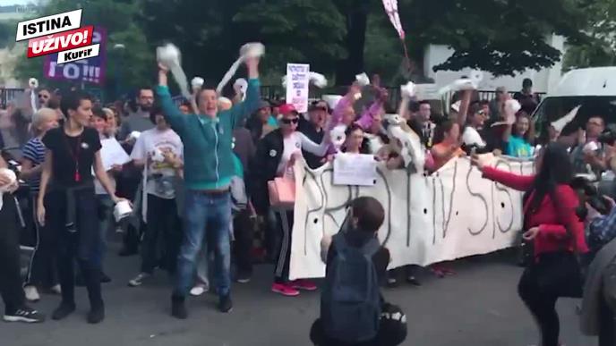 19.25 Građani gađaju zgradu RTS toalet papirom, skandiraju "Javna kuća Srbije"..