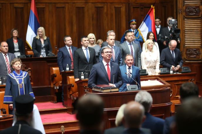 Predsednik Srbije Aleksandar Vučić rekao je u svom prvom obraćanju kao predsednika da oseća strah i nadu pri preuzimanju ove svete dužnosti i obaveze, ali da će raditi na tome da Srbija bude srećnija zemlja i da će u tom poslu dati celog sebe. Aleksandar Vučić položio je danas zakletvu i time preuzeo dužnost predsednika Srbije u narednih pet godina.