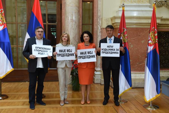 On je novinarima u parlamentu rekao da su dvoje poslanika Sande Rašković Ivić i Đorđa Vukadinovića, koji su na sednici nosili transparente na kojima je pisalo da Vučić navodno nije njihov predsednik, i otpužili ga za potpisivanja briselskih sporazuma.