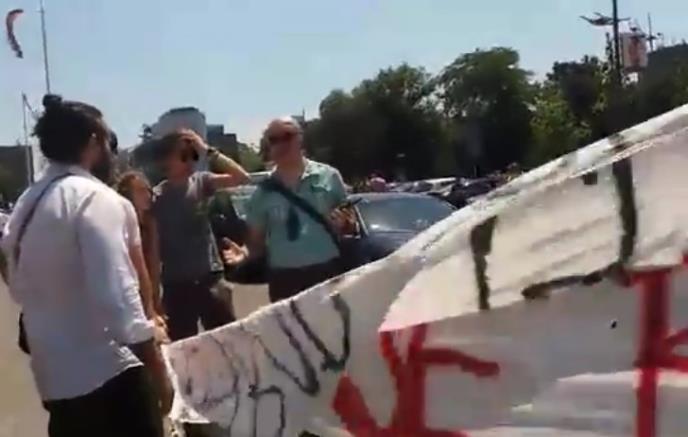 Učesnici protesta „Protiv diktature“ su grupu ljudi koja ih je zaustavila pitali da li su pripadnici policije u civilu, tražili su im legitimacije, nakon čega se ova grupa povukla.