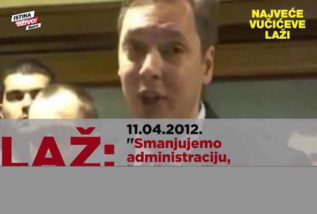 I ovo obećanje je staro nekoliko godina, a i dalje je neispunjeno. Naime, Vučić je u kampanji za izbore 2012. kao jedan od ciljeva svog programa naveo smanjenje državnog aparata i time velike uštede državi.