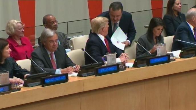 Potom mu pokazuje fotografije, Tramp se pomalo smeši i delimično pokazuje sliku i ženi koja sedi pored njega - ambasadorki Amerike pri UN Niki Hejli.