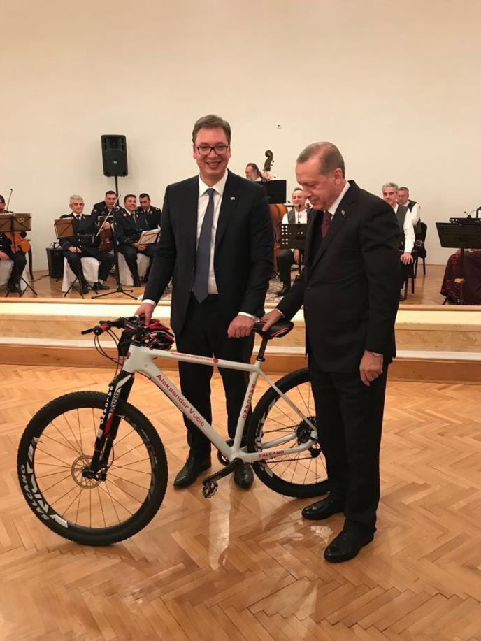 Osim bicikla koji je dobio kao počasni poklon, predsednik Srbije je dobio i stakleni šah, a za uzvrat on je Erdoganu poklonio zlatovez, pirotski ćilim, ali i i knjigu "Srbija od zlata jabuka".