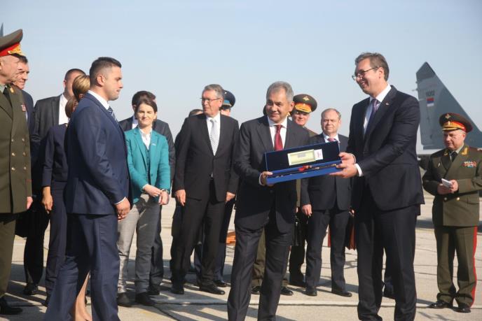 "Nadam se da ćemo našu saradnju uvećavati. Hvala vama lično na ogromnom anagžovanju. Živela Sbrija i srpsko-rusko prijateljstvo", poručio je Vučić koji je Šojguu predao jedan od šest paradnih bodeža sa serijskim brojevima migova. Paradni bodeži biće izloženi u Vojnom muzeju u Rusiji. Migove 29 Srbija je nabavila od Rusije pod najboljim mogućim uslovima.