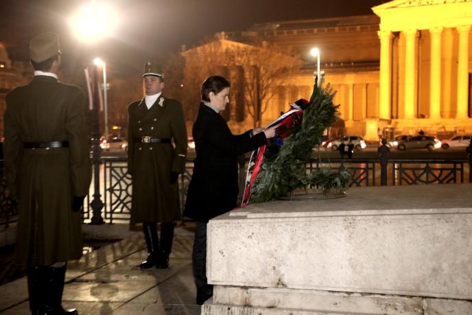 Premijerka Srbije Ana Brnabić položila je večeras venac na Grob neznanom junaku na Trgu heroja u Budimpešti.