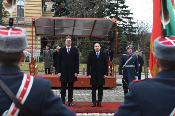 Predsednika Vučića svečano je na Trgu svetog Aleksandra Nevskog dočekao njegov domaćin, bugarski predsednik Radev.