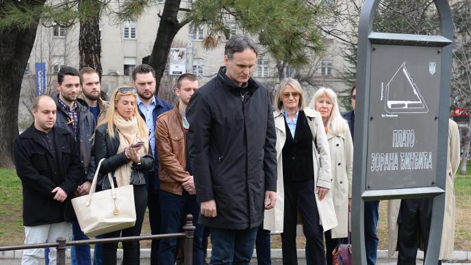 Članovi DS i bliski saradnici Zorana Đinđića, Gorica Mojović, Slobodan Milosavljević i Goran Ćirić položili su danas venac i na spomen-ploču ispred zgrade u kojoj je do 2000. godine živeo ubijeni premijer.
