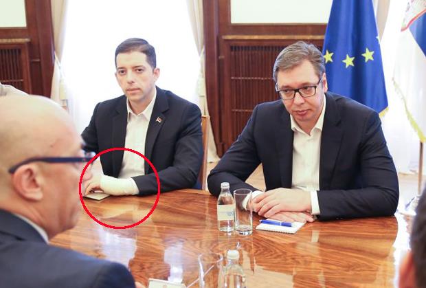 Đurić je stigao oko 11 časova na sednicu, a kako se može videti na fotografijama, ruke su mu zavijene u zavoje.