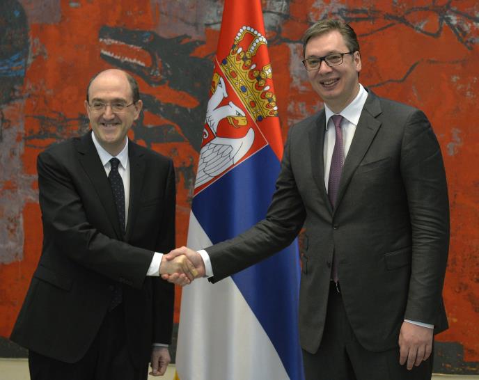 BEOGRAD - Predsednik Srbije Aleksandar Vučić primio je danas akreditivna pisma ambasadora Italije Karla Lo Kaša, koji mu je preneo pozdrave italijanskog predsednika Serđa Matarele.