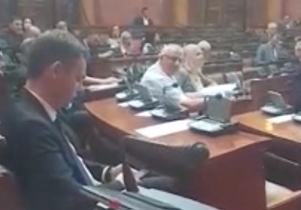 Kako se čuje na snimku, dok je Tepićeva govorila na sednici, predsednik SRS-a i joj je dobacio će joj "je..ti majku ustašku" i da "može da mu po..ši", dok je uputio i psovke Keni koji je izvadio telefon da ga snima.