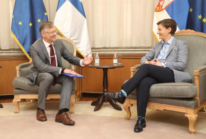 BEOGRAD - Premijerka Srbije Ana Brnabić razgovarala je danas sa ambasadorom Finske u Beogradu Pertijem Ikonenom, koji je istakao da Finska podržava proces evrointegracija Srbije i proširenje Evropske unije (EU).