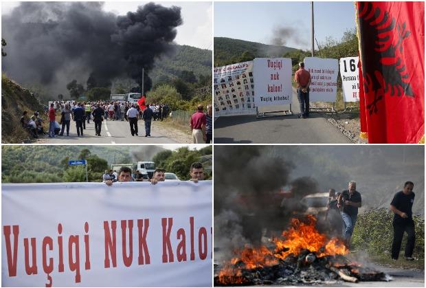 Grupa Albanaca je postavila žice, kamione, traktore, palila gume na barikadama. Nosili su i trasparente na kojima je pisalo "Vučiću, nećeš proći", sa albanskim zastavama i obeležjima OVK.