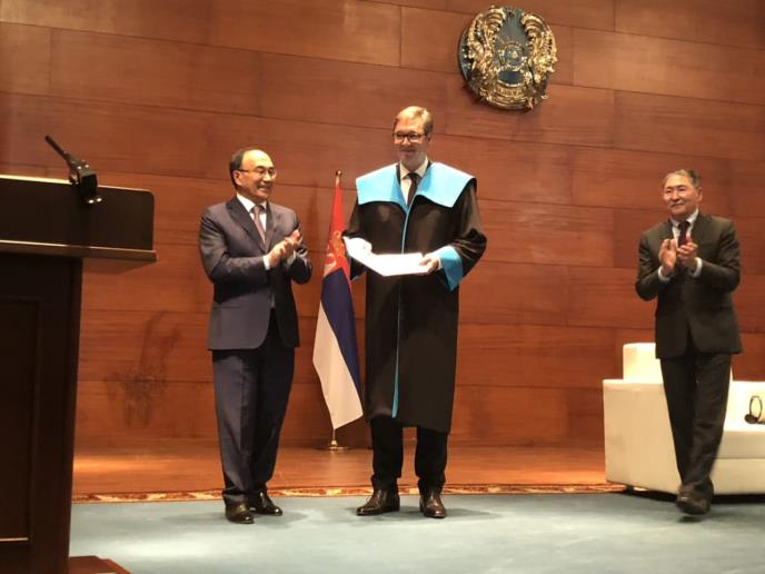 Naime, Vučiću je danas na Evroazijskom univerzitetu Gumiljov, dodeljena titula počasnog profesora, nakon što se obratio studentima u amfiteatru ove moderne obrazovne ustanove u Astani, istakavši da može da garantuje da će Srbija uložiti sve napore u očuvanju mira.