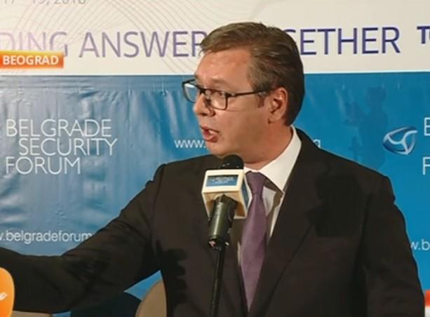 Vučić je na pitanje novinara iz Prištine u pauzi Beogradskog bezbednosnog foruma rekao da Beograd želi pregovore sa Albancima, ali da i oni moraju da razumeju da Srbija ima svoj interes, da ne doživljava Kosovo kao nezavisnu i suverenu državu i da je zato potrebno da se sedne i razgovara.