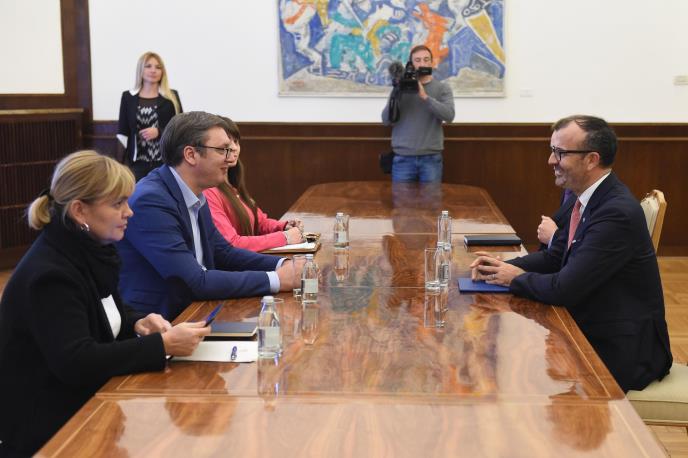 BEOGRAD - Predsednik Srbije Aleksandar Vučić danas je, na sastanku sa šefom Delegacije Evropske unije, ambasadorom Semom Fabricijem, rekao da će Srbija nastaviti da intenzivno radi na ispunjavanju evropske agende, sa ciljem otvaranja novih poglavlja i bržeg napretka na putu ka članstvu ka EU.