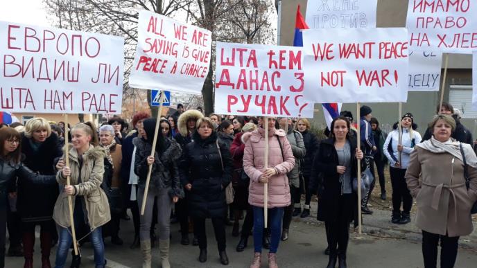 KOSOVSKA MITROVICA - U Kosovskoj Mitrovici danas je održan protest, Marš žena, skup hiljade žena iz KM, Leposavića i Zvečana koje su se okupile kod kancelarije EU i EULEKS-a u Severnoj Mitrovici da zajedno postave svetu pitanje da li deca srpskih majki imaju prava kao i sva druga i zašto moraju da se bune uz sirenu za uzbunu..
