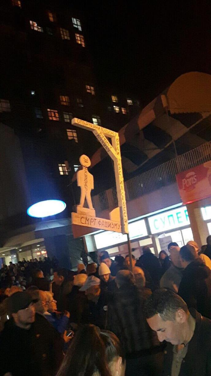 VEŠALA I U KRAGUJEVCU: Priveden Kragujevčanin koji je na protestu nosio maketu vešala sa natpisom Smrt fašizmu