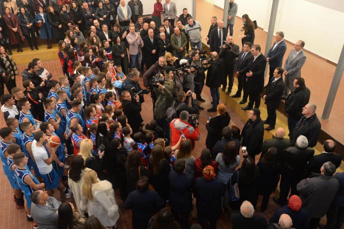Predsednik Aleksandar Vučić posetio je danas Tehničku školu i Gimnaziju u Tutinu, koje rade u istoj zgradi, obnovljenoj uz ulaganje od 116 miliona dinara, gde su ga đaci i nastavnici dočekali gromoglasnim aplauzom, a on prihvatio košarkašku loptu od jednog đaka i "izdriblao" je.