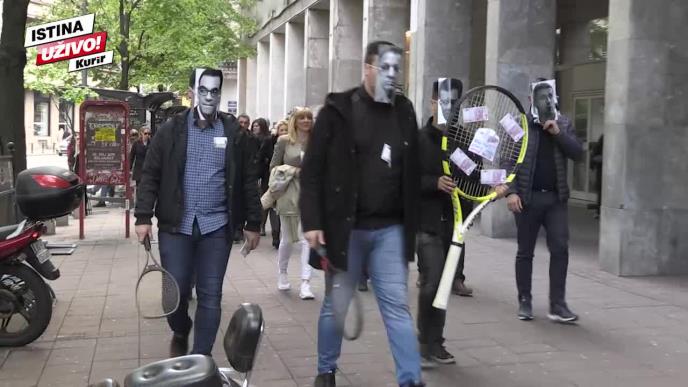 Odbornici SNS-a su sa maskama na licu simbolično doneli teniske rekete i lažne novčanice, revoltirani time što kako je rekao zamenik šefa odborničke grupe SNS-a u Skupštini grada Beograda Radoslav Marjanović, predsednik opštine Stari grad Marko Bastać, zajedno sa svojim saradnicima reketira građane za postavljanje letnjih bašta.