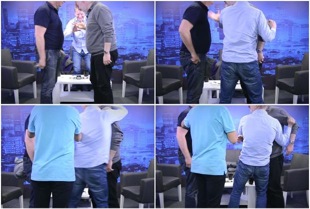 Sve vreme voditelj Teša Tešanović je pokušavao da smiri situaciju i da ih sve vreme drži razdvojene da ne bi došlo do fizičkog obračuna. Kad to nije pomoglo uključio i se i kamerman da pomogne.