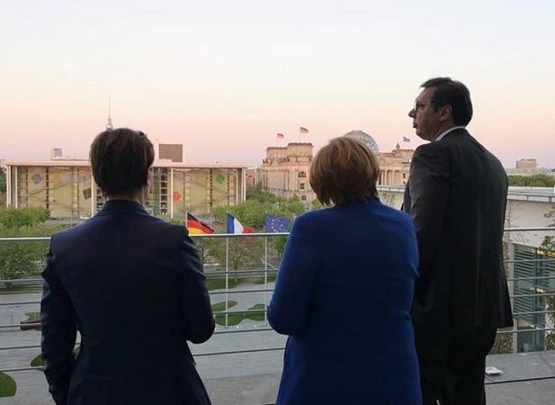Na jednoj od slika u razgovoru, pored Vučića, Merkelove i Makrona, učestvuje i albanski premijer Edi Rama, kao i predstavnici Prištine.