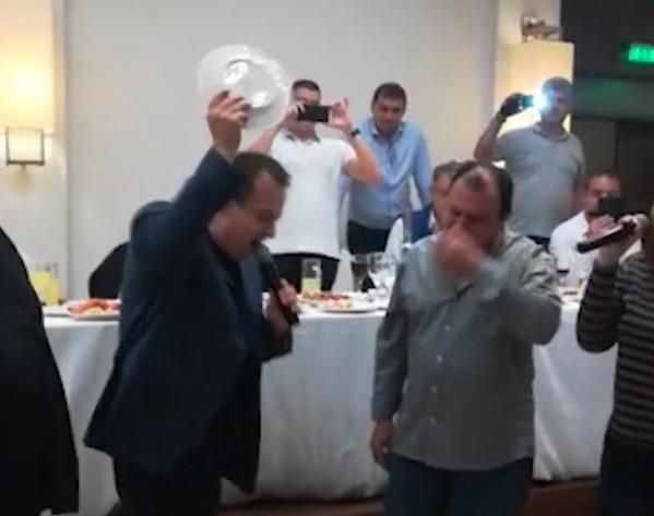 Na svečanoj večeri, koju je predsednik Jedinstvene Srbije Dragan Marković Palma upriličio za oko 1.200 privrednika, Dačić je za grčke prijatelje otpevao čuvenu grčku pesmu "Mi mou thimonis matia mou" ("Ne ljuti se na mene oko moje"). Na kraju je razbio tanjir!